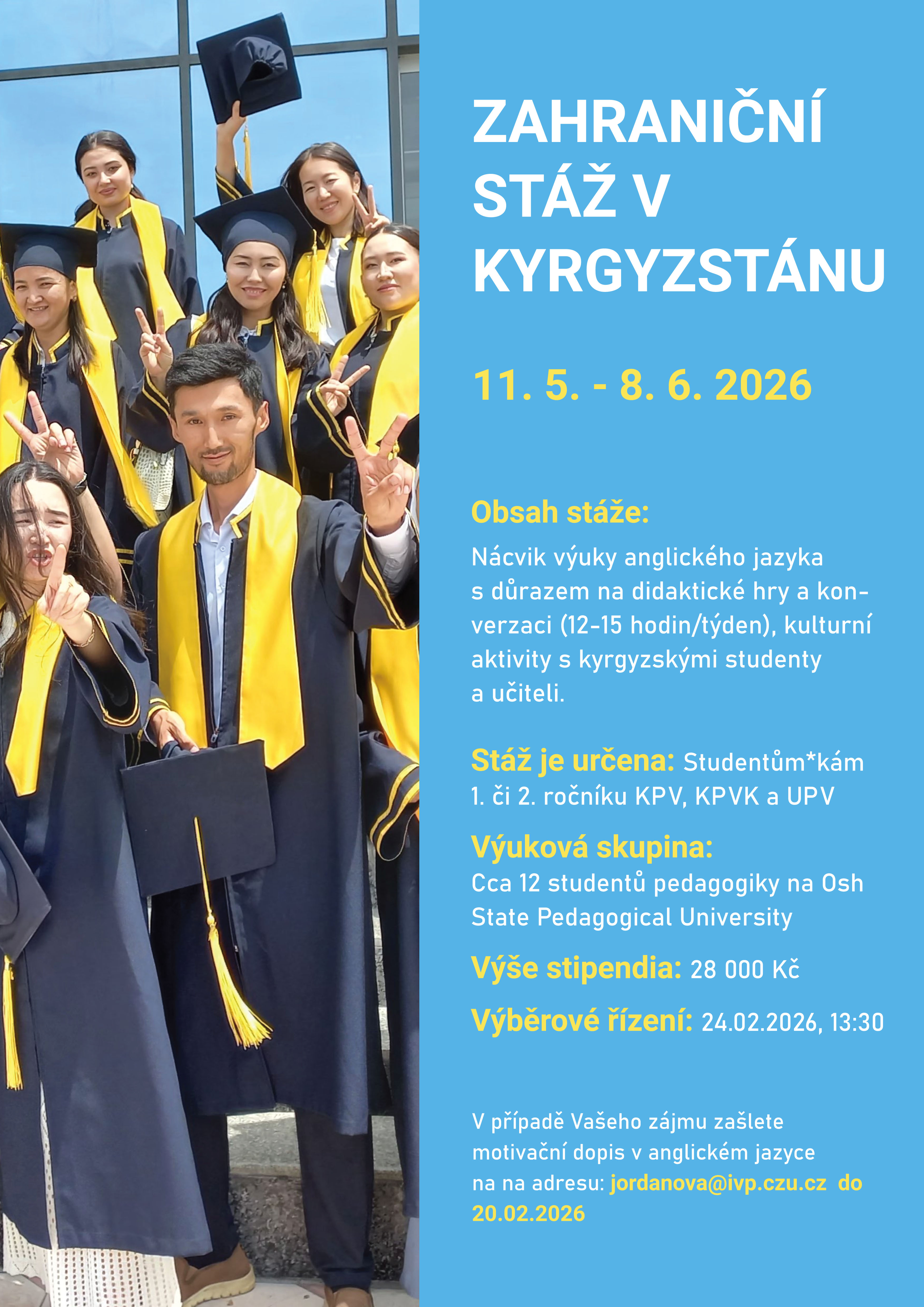 Pět vybraných studentů 1. a 2. ročníku programů Kariérové poradenství a vzdělávání a Učitelství praktického vyučování má možnost absolvovat svou praxi netradičním způsobem – ve Společném středisku jazykového vzdělávání v Hanoji nebo na Osh State Pedagogical University v Kyrgyzstánu.